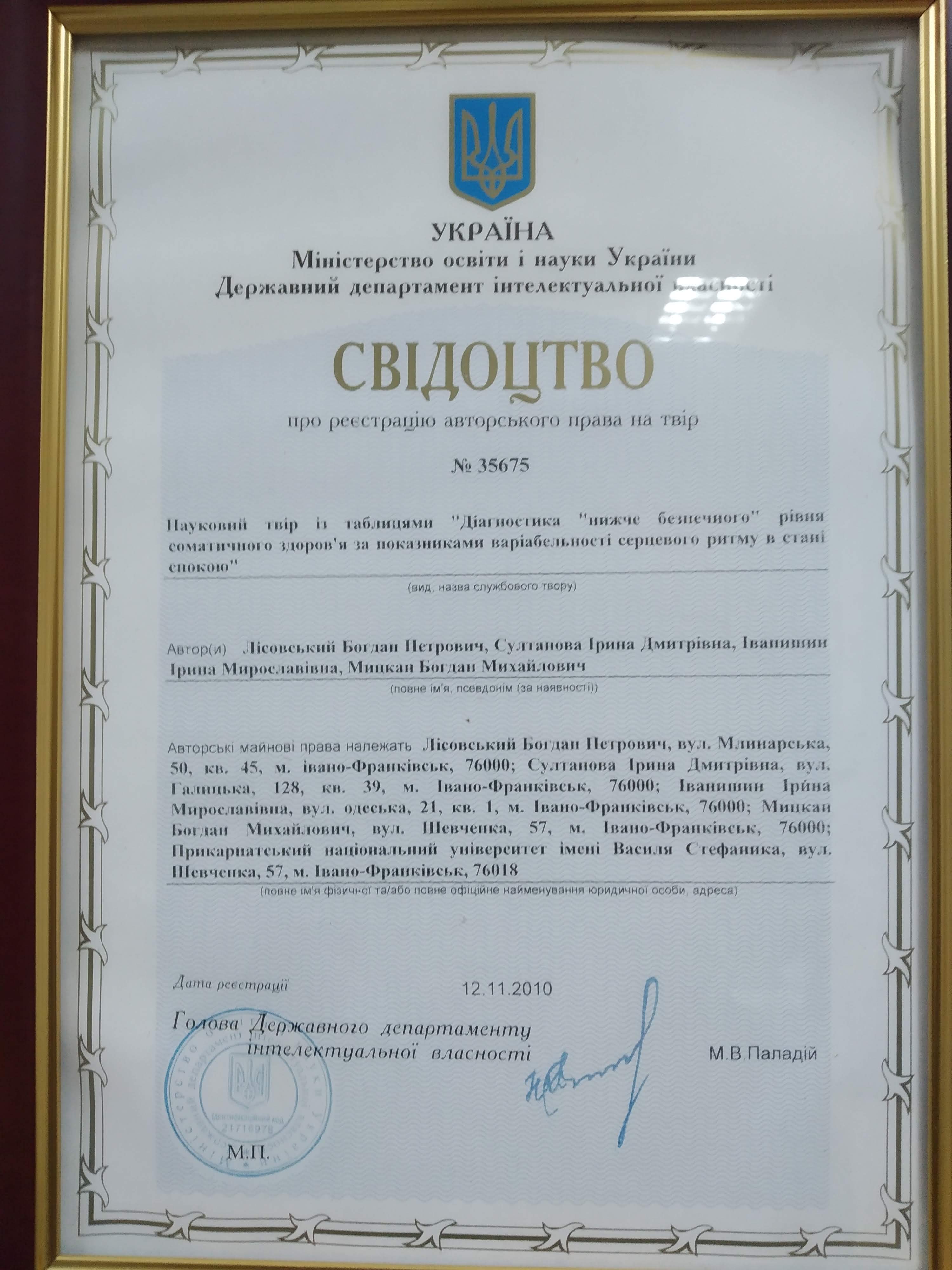 Бібліографічний опис: | Свідоцтво про реєстрацію авторського права на твір № 35910 / Б.П. Лісовський, І.Д. Султанова, І.М. Іванишин, Б.М. Мицкан // Діагностика «нижче безпечного» рівня соматичного здоров’я за показниками варіабельності серцевого ритму в стані спокою / Заявка № 35910 від 14.09.2010 року. |