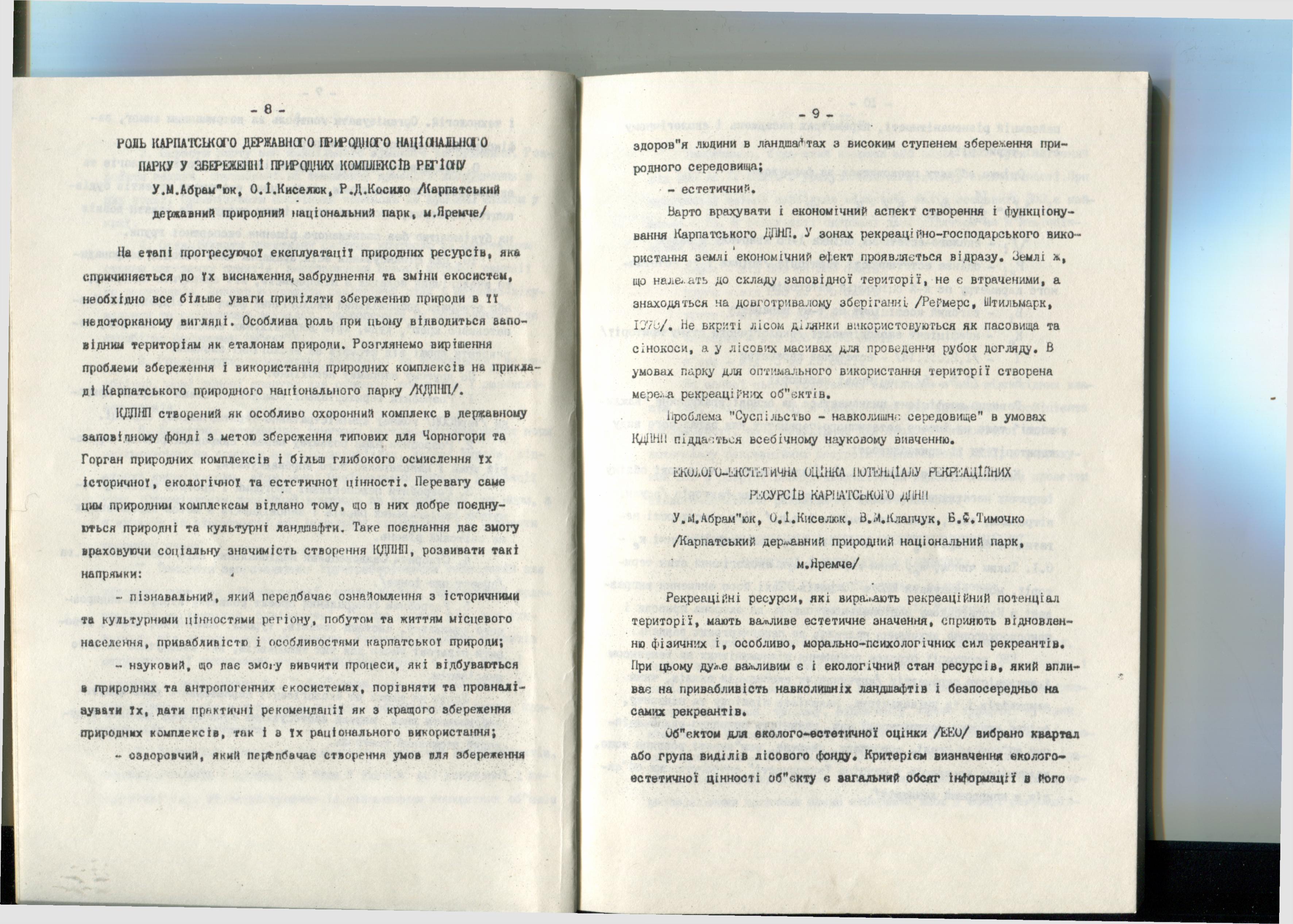 Citation: Абрам’юк У.М. Еколого-естетична оцінка потенціалу рекреаційних ресурсів Карпатського ДПНП / У.М. Абрам’юк, О.І. Киселюк, В.М. Клапчук, Б.Ф. Тимочко / Зб. тез. доп. міжнар. н.-п. конф. «Проблеми Гуцульщини». – Чернівці-Косів, 1993. – Ч. I. – С. 9–11.