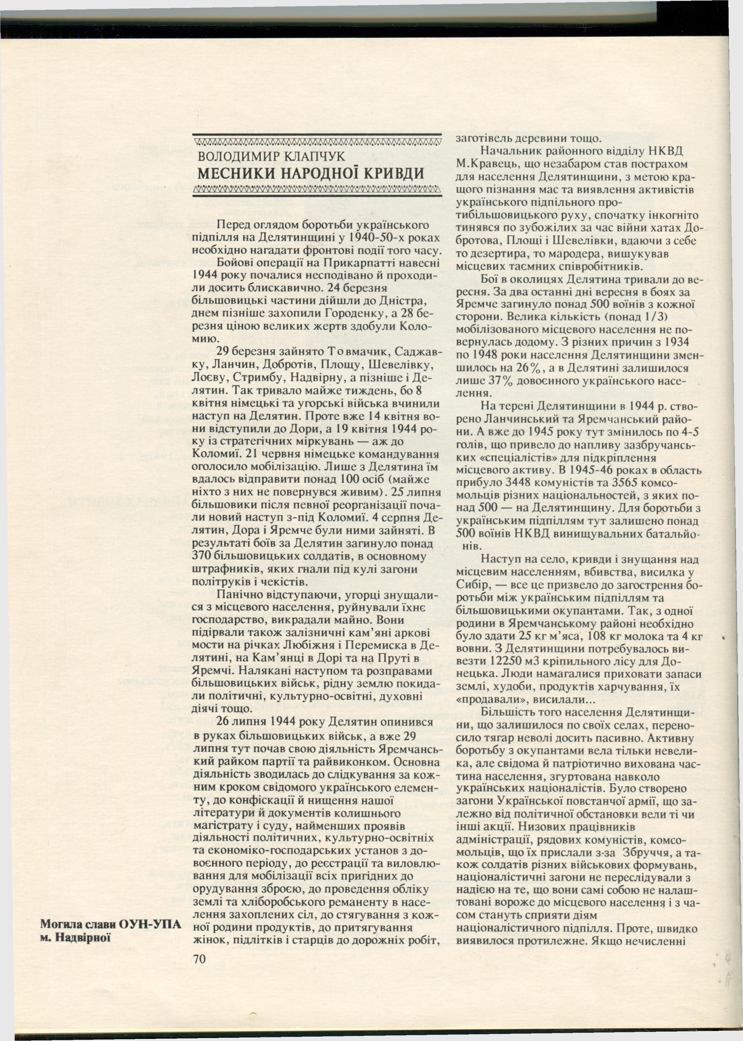 Citation: | Клапчук В. Месники народної кривди / В.М. Клапчук/ Страгора (Книга про Надвірнянщину). – Львів : Світло і тінь, 1994. – С. 70–74. |