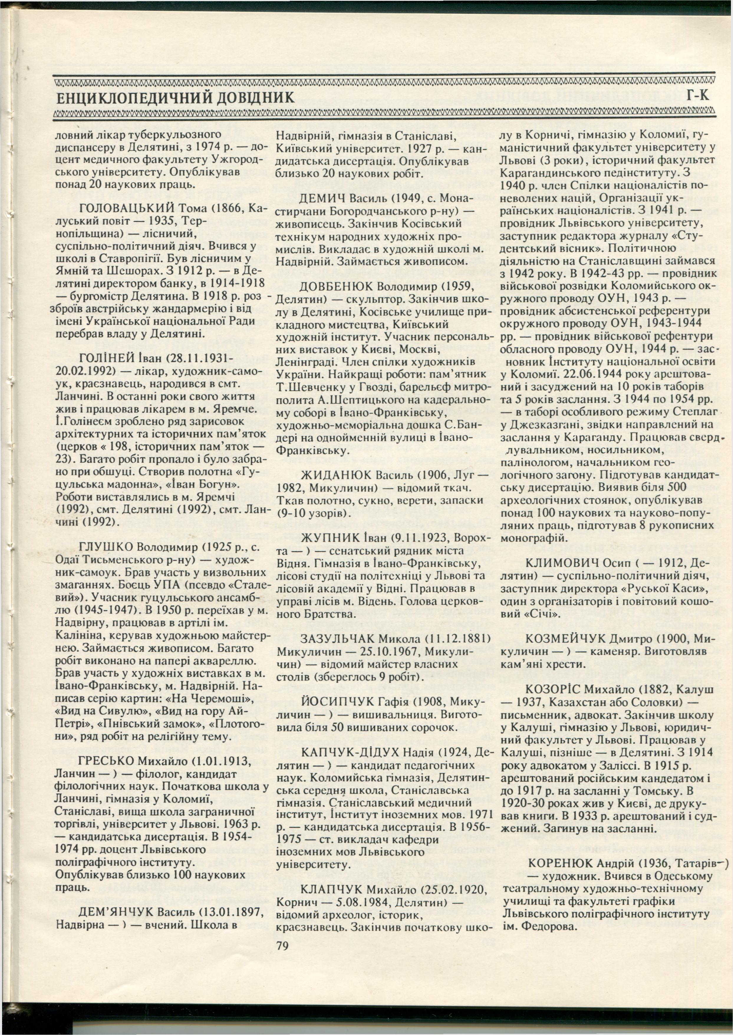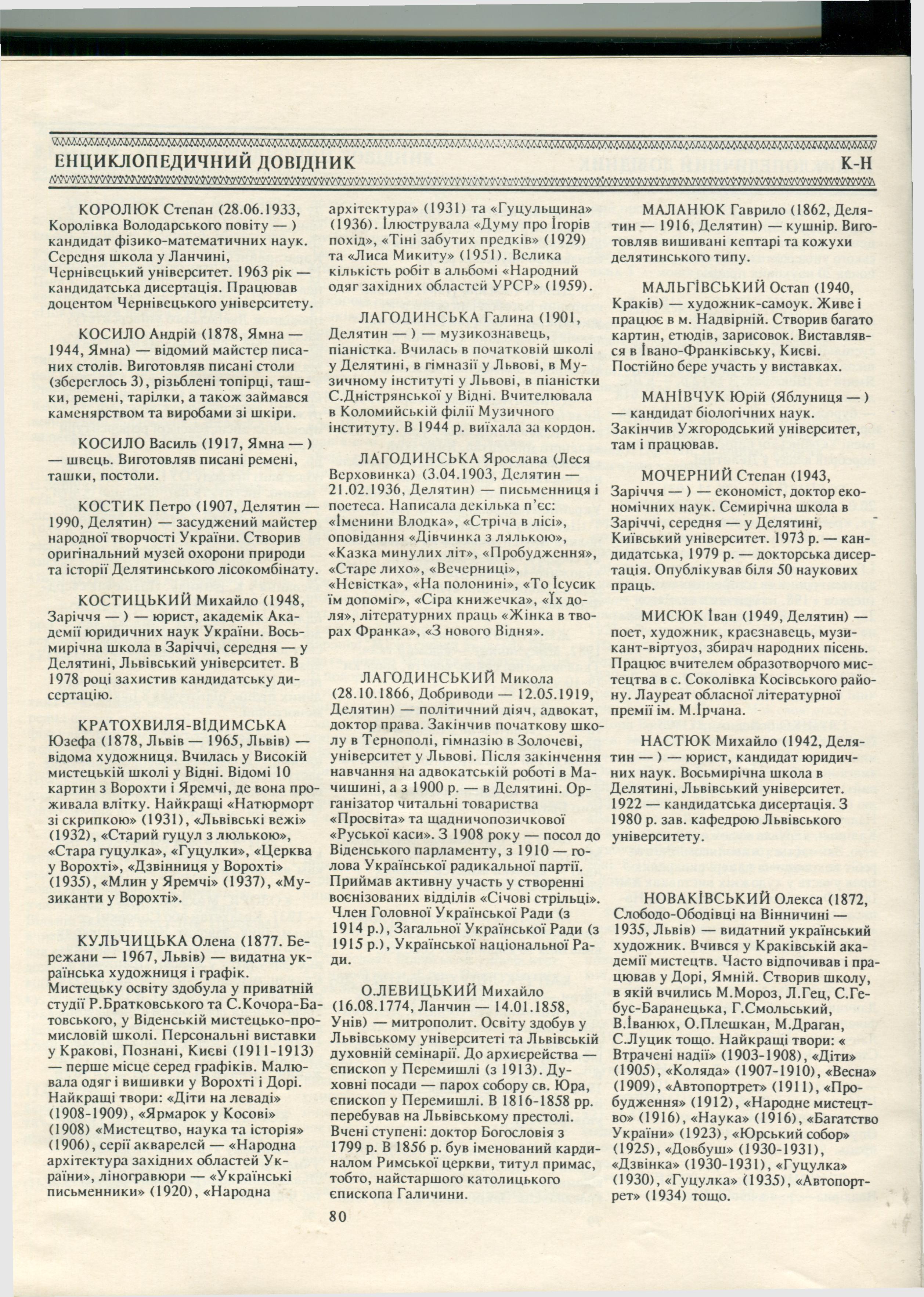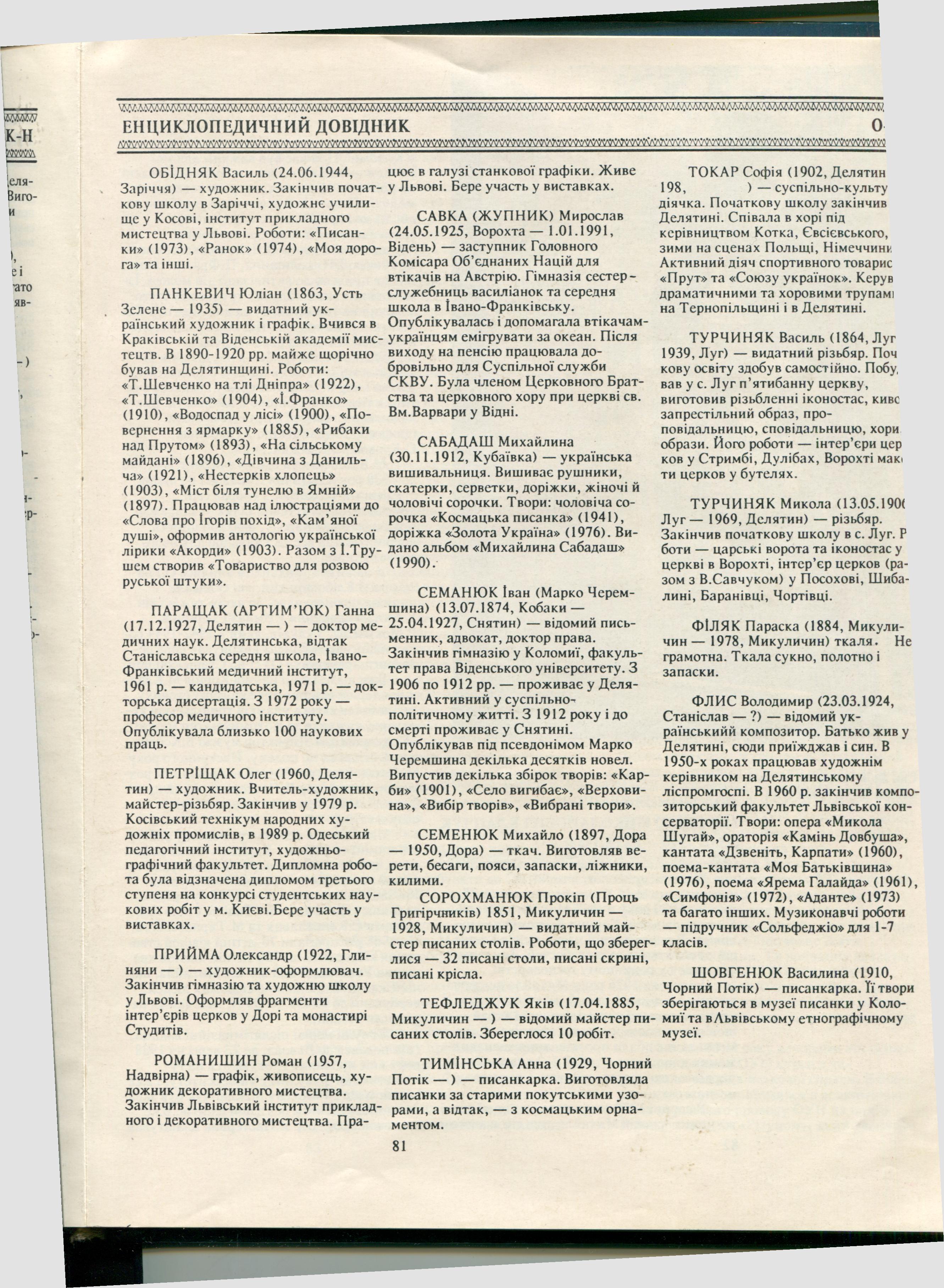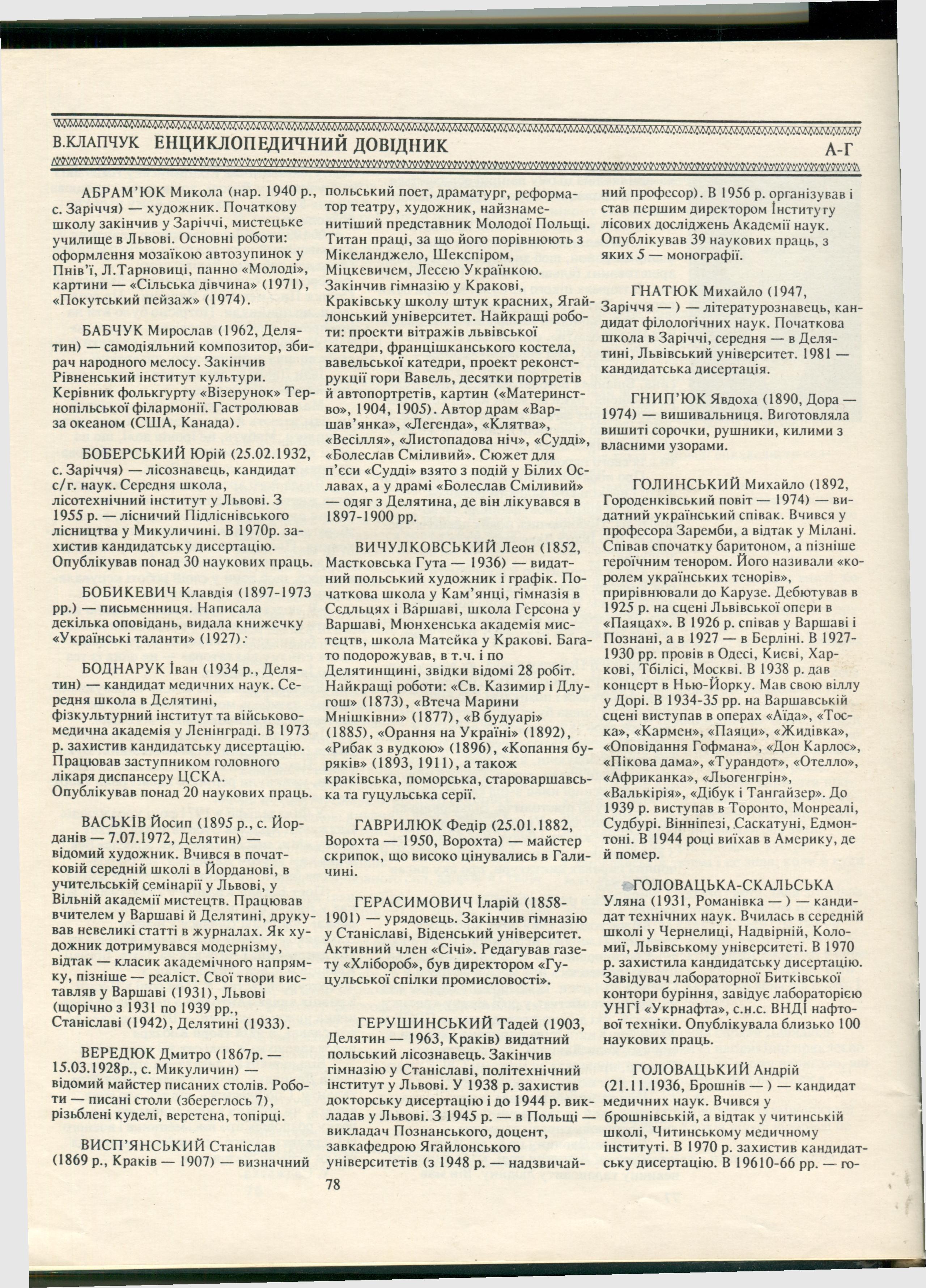 Citation: | Клапчук В. Енциклопедичний довідник / В.М. Клапчук / Страгора (Книга про Надвірнянщину). – Львів : Світло і тінь, 1994. – С. 78–81. |