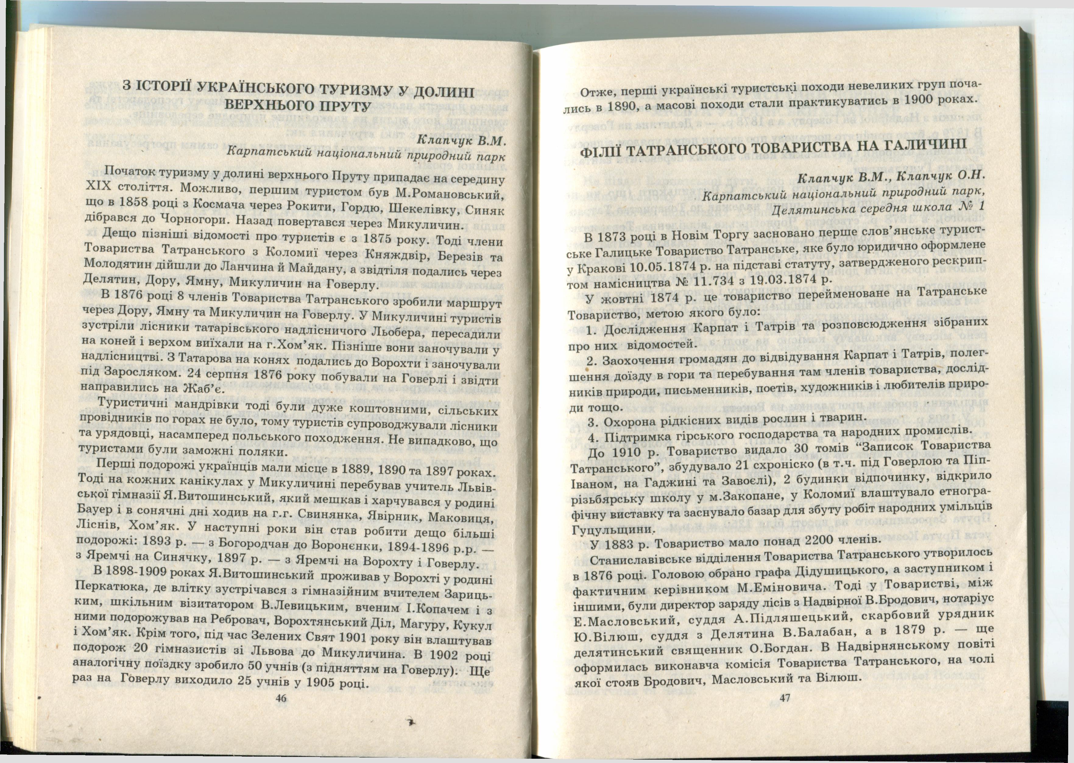 Citation: | Клапчук В.М. З історії українського туризму у долині верхнього Пруту / В.М. Клапчук / Зб. тезів доп. н.-п.конф. «Екологічні передумови розвитку рекреації на Гуцульщині». – Яремче, 1996. – С. 46–47. |