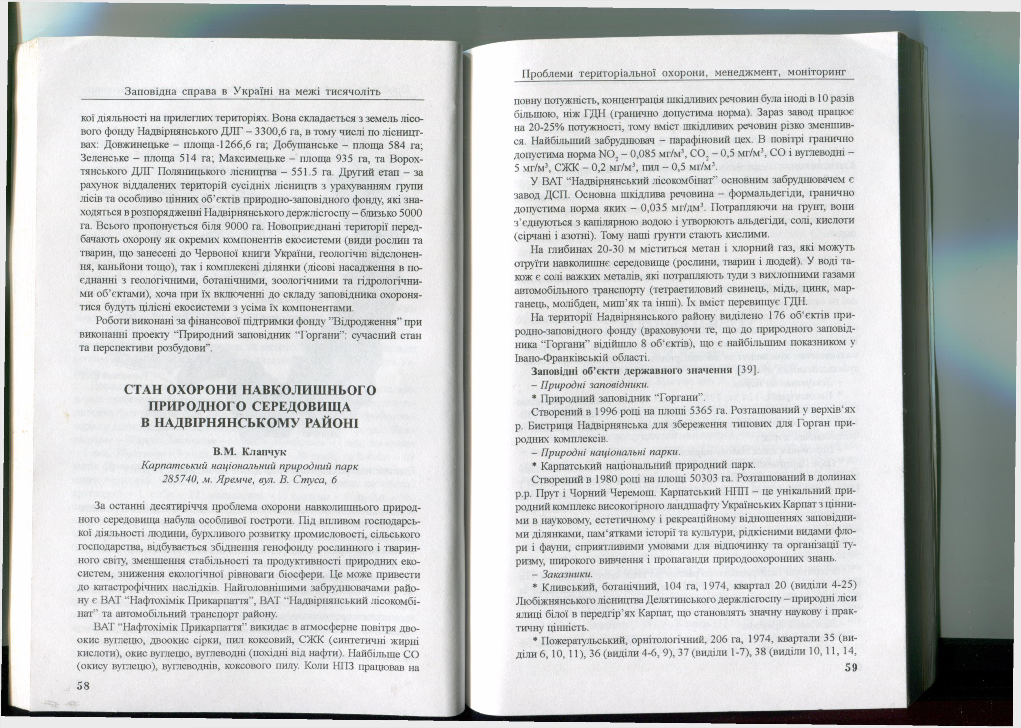 Бібліографічний опис: Клапчук В.М. Стан охорони навколишнього природного середовища в Надвірнянському районі / В.М. Клапчук / Заповідна справа в Україні на межі тисячоліть (сучасний стан, проблеми і стратегія розвитку) : Мат. всеукр. загальнотеор. та н.-п. конф., присв. виконанню держ. програми персп. розвитку зап. справи в Україні «Заповідники»). – Канів, 1999. – С. 58–61.