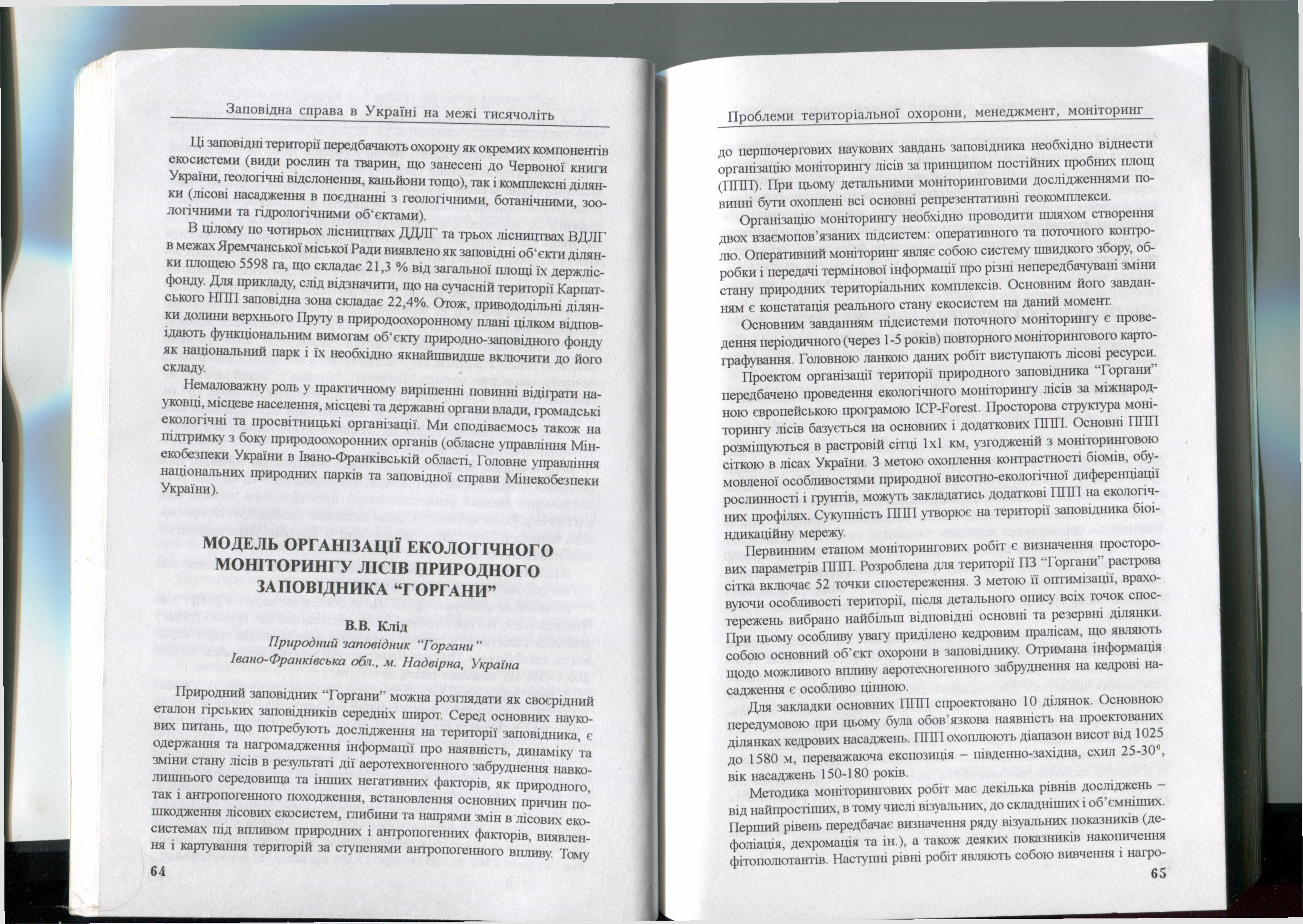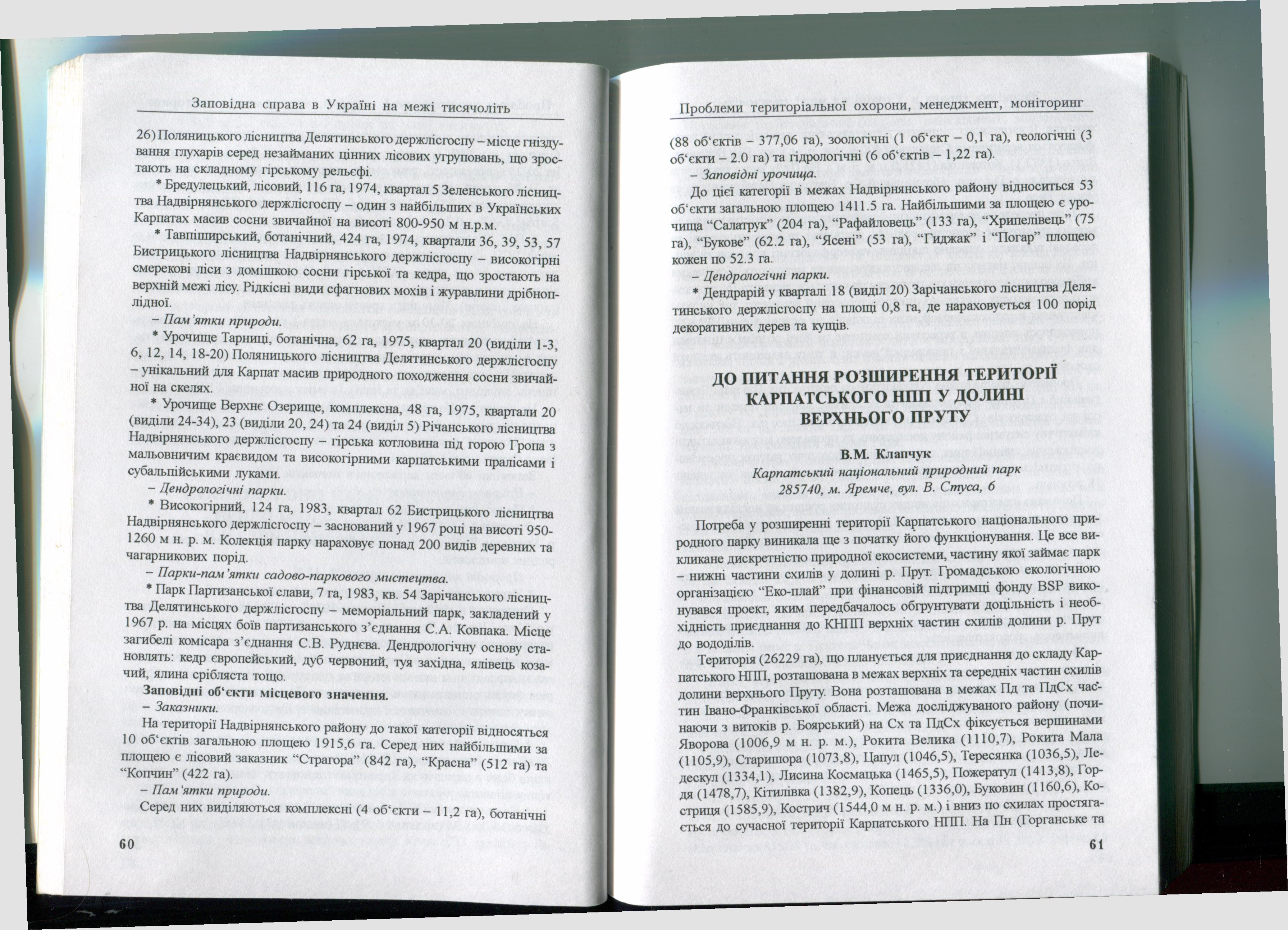 Бібліографічний опис: Клапчук В.М. До питання розширення території Карпатського НПП у долині верхнього Пруту / В.М. Клапчук / Заповідна справа в Україні на межі тисячоліть (сучасний стан, проблеми і стратегія розвитку) : Мат. всеукр. загальнотеор. та н.-п. конф., присв. виконанню держ. програми персп. розвитку зап. справи в Україні «Заповідники»). – Канів, 1999. – С. 61–64.